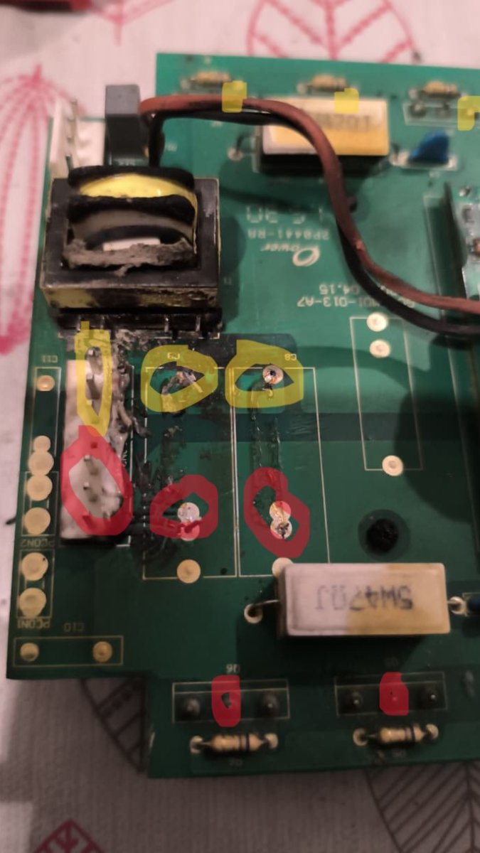 12. Транс этот не трогайте. Это датчик тока и он вряд ли сгорел. Там гореть нечему. Кондёры такие же, что и у выхода на трансы. Это резонансные по питанию 310 постоянки.