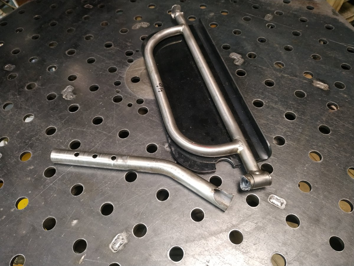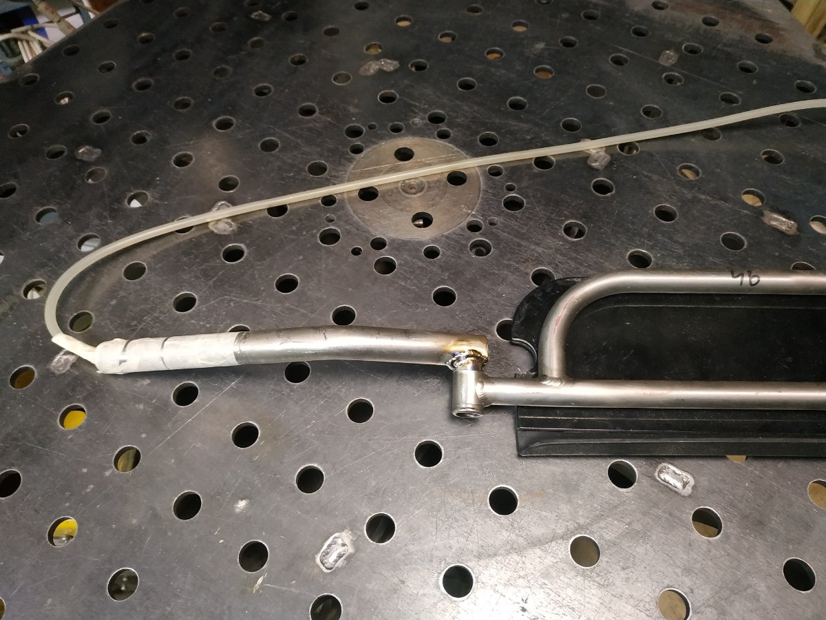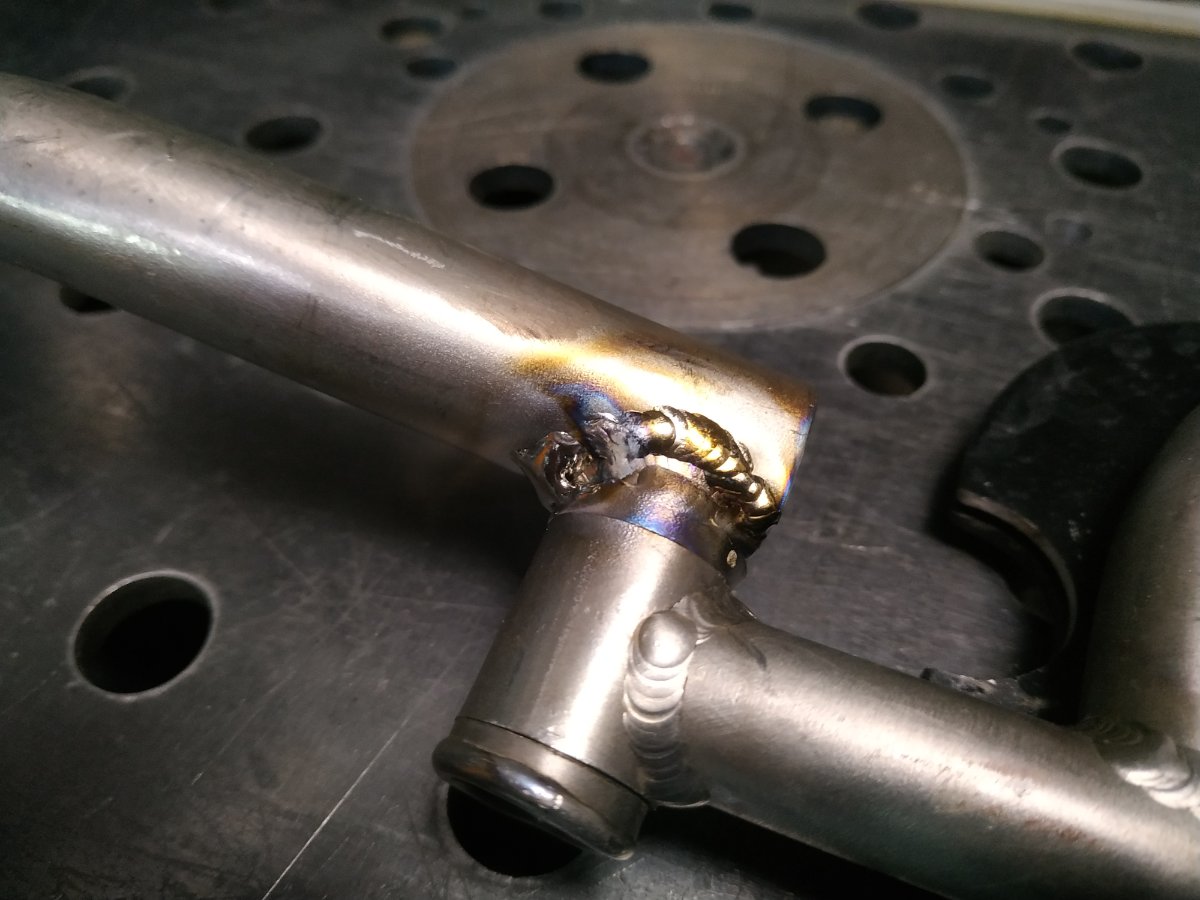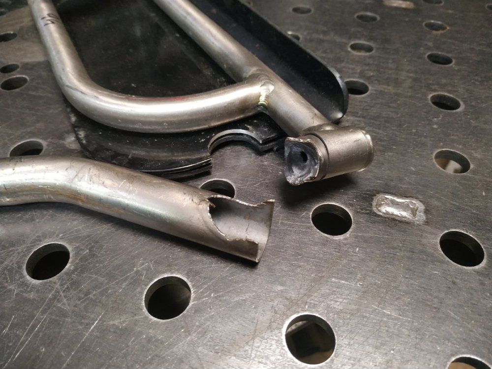 Опора для ног (наверное) инвалидной коляски. Титан. Такое ощущение что из-за охрупчивания, по границы шва, лопнуло. У меня, похоже, получилось не намного лучше - внутри трубы белесый налет, хотя дул 10 л/мин. П.С. Мой шов желтый от нагрева с противоположной стороны, а так он был белый и пушистый.