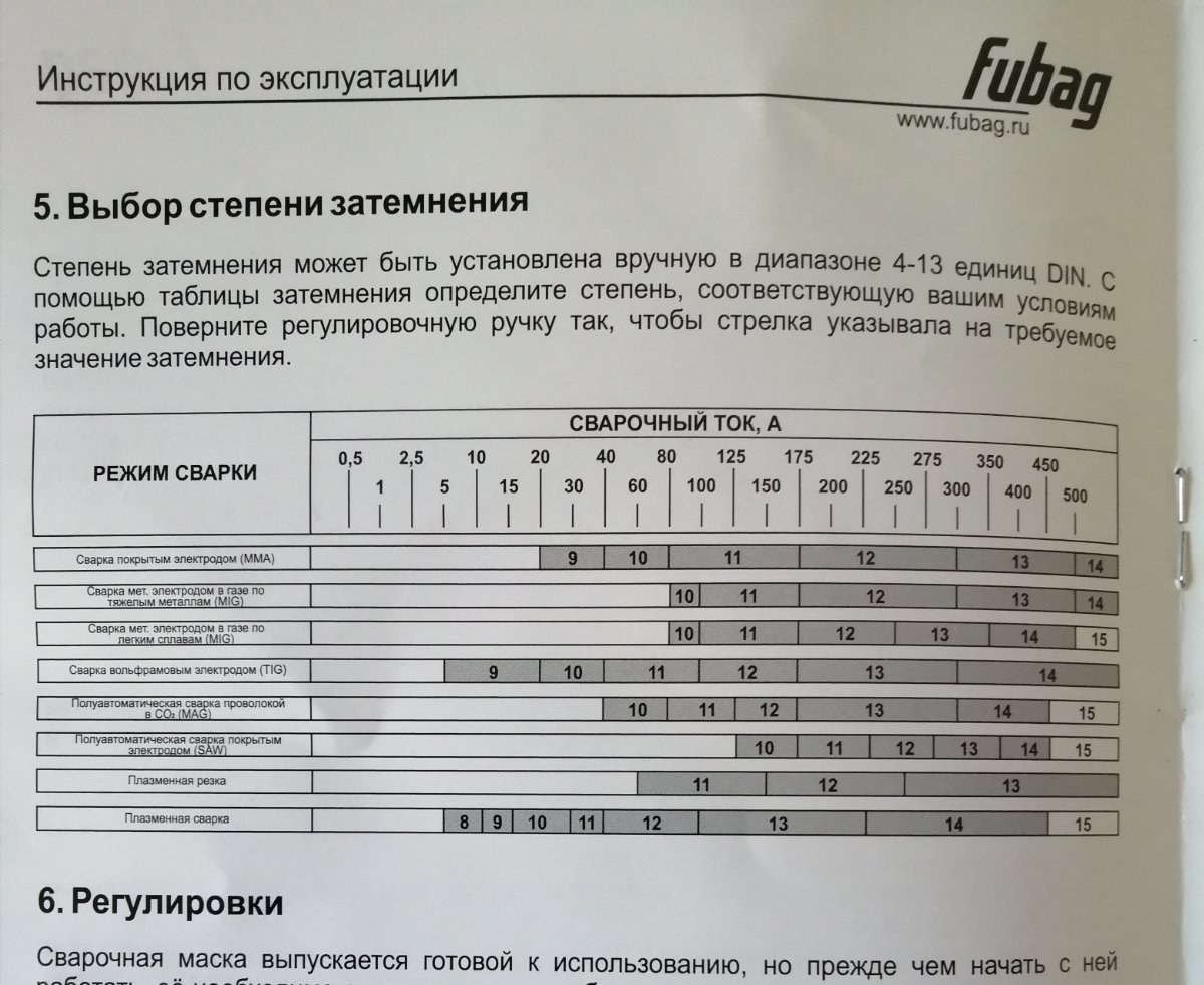 3. Интернет у меня не по талонам, маска хамелеон Фубаг за 4,5 килорубля, в инструкции там есть таблица настроек. Смысл вопроса был в том, что у каждого глаз по-разному видит через стекло, поэтому на одном токе разные сварщики используют разные уровни затемнения. Я, например, не заметил особой разницы между 9 и 11 уровнем. Ну, может, чуть потемнее.