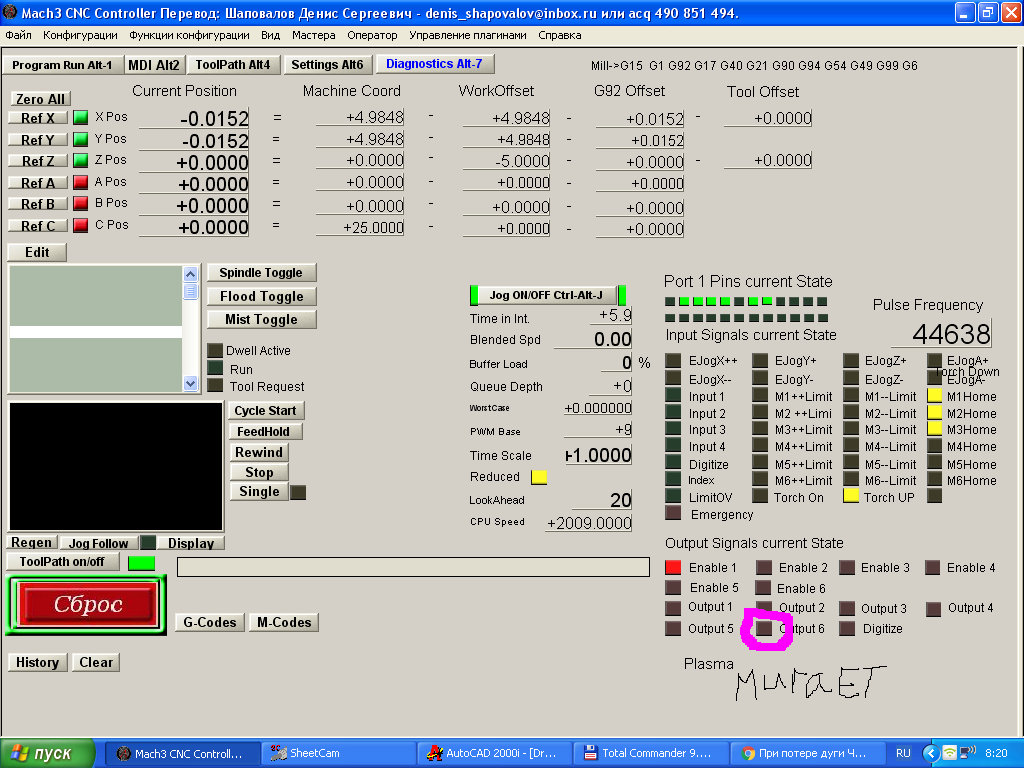 556 Опубликовано 14 сентября, 2017 Автор Поделиться Опубликовано 14 сентября, 2017 @556, галочка "управление шпинделем" стоит?Похоже у вас реально проблемы с контроллером THC или делителем напряжения. Какое напряжение показывает THC в момент когда дуга погасла? Как выглядит всё ваше хозяйство, если не секрет (не обзорные планы, а коммутация, блоки, скрины мача в критические моменты).Какой алгоритм первого поджига? Может контроллер THC не переключает входы сигналов концевиков парковки на входы от показаний делителя напряжения и у программы всегда истина на "THC On" и "THC Up". А плазма поджигается первый раз, потому, что горелка оказалась на приемлемой высоте и подали напругу. Может раньше работало. По идее, если нет сигнала "THC On" от контроллера THC, плазма не зажглась (погасла), софт это должен учитывать и тогда - повторный поджиг, или останов и ожидание действий оператора. При погасшей дуге на THC должно быть зеро.Во время реза показания на ТНС скачат , не стабитьные (например если я выставил 136 они прыгают постоянно и разобрать их не возможно). Это при выключенном ТНС. А при включенном вообще резак сам произвольно подымается до ТНС мах - 50 и едет дальше Ссылка на комментарий Поделиться на другие сайты Поделиться